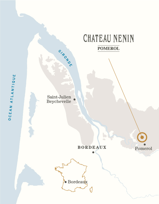 Le vignoble du Château Nénin s’étend d’un seul tenant à l’exception d’une seule parcelle. Néanmoins, le Grand Vin n’est produit que sur les meilleures parcelles, 8 hectares des plus grands terroirs argilo-graveleux situés sur le plateau de Pomerol. Les parcelles attenantes, en contrebas, sont dévolues à la production du second vin, la Fugue de Nénin. En conséquence son terroir comprend toute la diversité de sols qui caractérise Pomerol. Il est principalement constitué de dépôts oligocènes recouverts de formations graveleuses alluviales de la Dordogne ; des argiles et graviers siliceux, des quartz, des granites, de la crasse de fer ainsi que des galets de basalte. Les vignes du Château Nénin sont plantées sur du plateau de Pomerol.